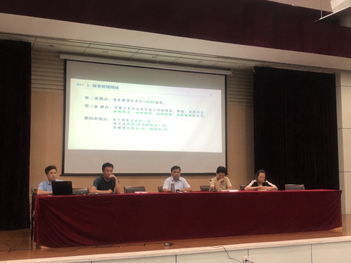 物业公司林燕飞主管代表宿舍管理团队欢迎2019级住宿新生来到“新家”,并承诺努力做到严格管理和温馨服务,努力扮演好三个角色——“妈妈”、“老师”和“警察”。王富强老师与全体住宿生新生详细解读《无锡开放大学学生宿舍管理条例》的各项规定,并列举了一些其他学校住宿生发生的惨痛案例,告诫要注意宿舍安全,严格遵守管理条例。后勤装备保障处胡云副处长对校园一卡通做了耐心细致的辅导,并代表部门作出了全心全意服务的承诺。校学生宿舍自主管理委员会张露露同学用视频和图片全面介绍了宿管会,展示了丰富多彩的住宿生活,副会长夏庆燕同学向全校学生发出了“文明住宿我先行”的倡议。团委副书记庄璟老师从发挥共青团员的先锋模范作用和从严治团的角度,号召全体住宿生团员要主动亮身份、敢于担当,带头遵守宿舍规定、争创文明宿舍。