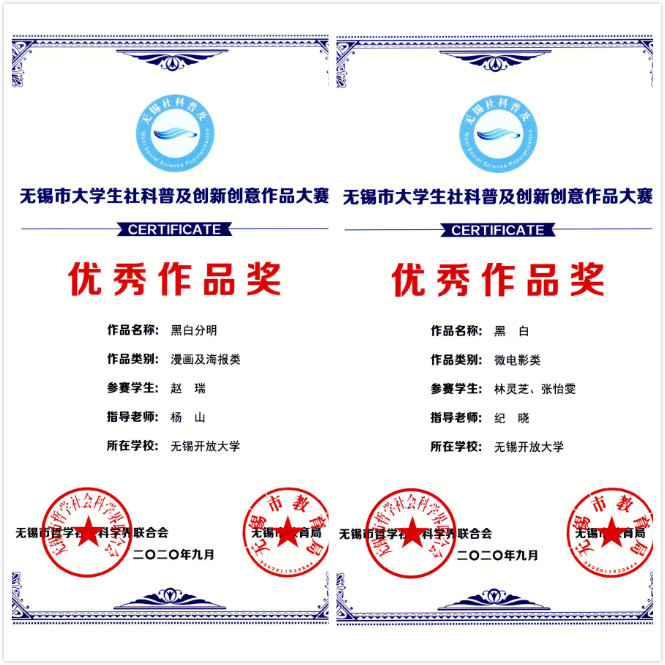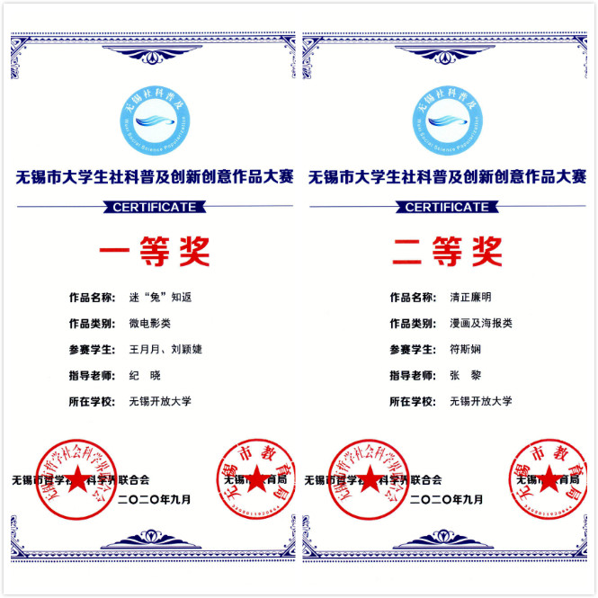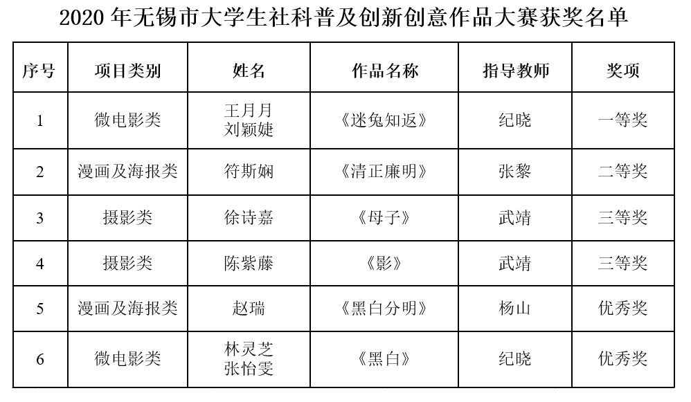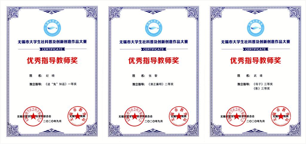 近日,在由无锡市社科联、无锡市教育局主办的2020年无锡市大学生社科普及创新创意作品大赛中,我校学生作品获一等奖1项,二等奖1项,三等奖2项,优秀奖2项。艺术教研室张黎、武靖、纪晓三位老师被评为“优秀指导老师”。