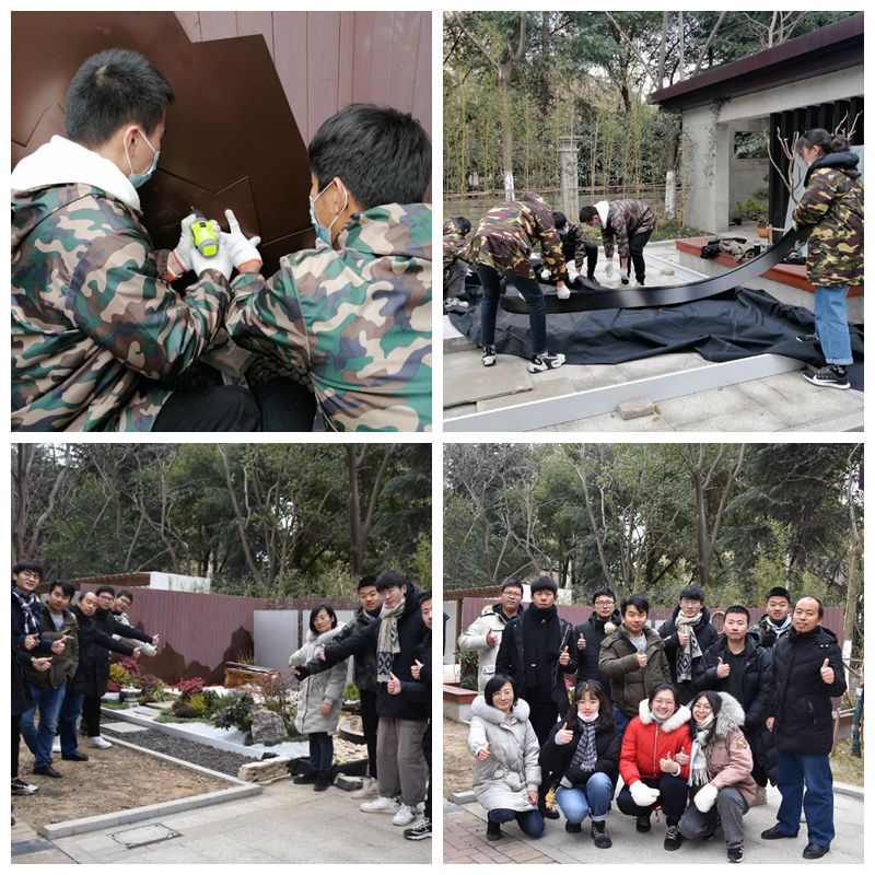 该庭院景观作品由我校环境与艺术系园林专业的各年级部分同学在李传磊、陈坚两位老师全程指导下完成。根据大赛要求,参加此次花园大会的作品必须提交设计图纸、设计说明、手绘效果图、计算机辅助设计效果图。为了能在一个月内顺利报名并参加花园大会,园林专业的师生在做好期末复习之余,加班加点,从方案的确定到出效果图、材料选购、直至庭院施工,大家都积极主动,热情高涨,尤其是在施工过程中,陈坚老师和同学们主动放弃元旦休假到校帮助卸货,一袋袋黄沙石子,一盆盆花卉草木,一块块沉重的造景石……虽然很辛苦,但无人言苦。接下来,陈坚、李传磊两位老师带领同学们,冒着严寒、早起晚归,花了整整三天时间,按照设计图纸,进行空间布置、水电安装、植物配置、置石铺装等工程施工,发扬精益求精的工匠精神,齐心协力,终于把设计创意变成了实体庭院景观。参与师生脱下工作服和破损手套,站在自己潜心施造的作品前,感慨万千,成就感油然而生,个个都洋溢欢快笑容;听着周边老师同学们的啧啧称赞,大家心里充满了“走向新我,成长大我”的自豪和骄傲。相信参与师生日后在自己的专业领域里将以此次造园实践为新起点走的更稳更自信。