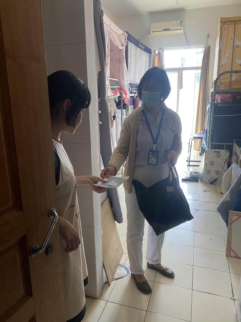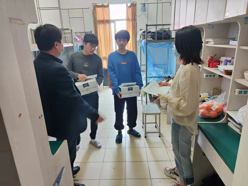 学校党委成员实行24小时住校值班制度,带头示范,与各学院负责人、班主任、党员教师时常走进宿舍,与因疫情不能离校的住宿生深入谈心谈话,详细询问校园封闭管理期间同学们的日常生活的作息情况,希望大家能够调整好个人状态,合理作息,保持良好的精神面貌投入学习和生活中,提醒同学们注意保持个人生活卫生,强化防疫意识,切实做好个人防护,按时对宿舍进行通风,及时清理垃圾,培养良好的生活习惯。4月9日上午张旭校长带领各学院、职能部门值班教师为住宿学生及时送上住宿学生礼包。