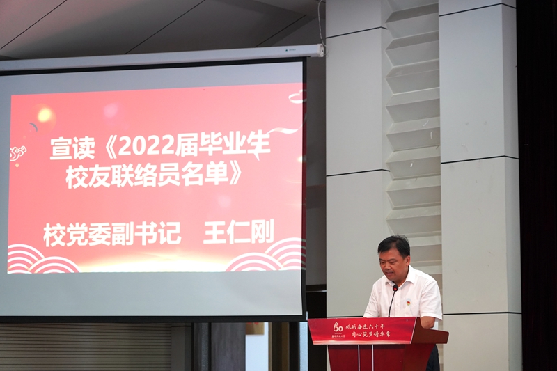 校友是学校事业发展的宝贵资源和强大动力。教务处处长丁晓华向校友联谊会办公室主任、学生工作处处长杨勇移交了2022届校友名册。校党委副书记、校友联谊会常务副会长王仁刚代表学校宣读《关于聘任2022届校友联络员的决定》,并与唐东副校长、邵小明副校长一起为新聘任的校友联络员代表颁发聘书。