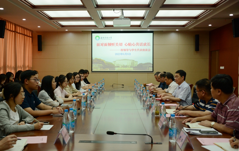 为进一步贯彻落实“以学生为中心”的发展思路,倾听学生心声,回应学生关切,助力学生成长,构建学生与学校党政领导、职能部门沟通交流的常态化工作机制,6月8日下午我校在行政楼四楼会议室组织召开了“面对面倾听关切 心贴心共话成长——校领导与学生代表”座谈会。来自各学院的20位学生代表和党委书记奚小网,校长、党委副书记贾厚林,党委副书记王仁刚,副校长邵小明及相关职能部门负责人齐聚一堂、欢快畅谈。会议由学生工作处杨勇处长主持。