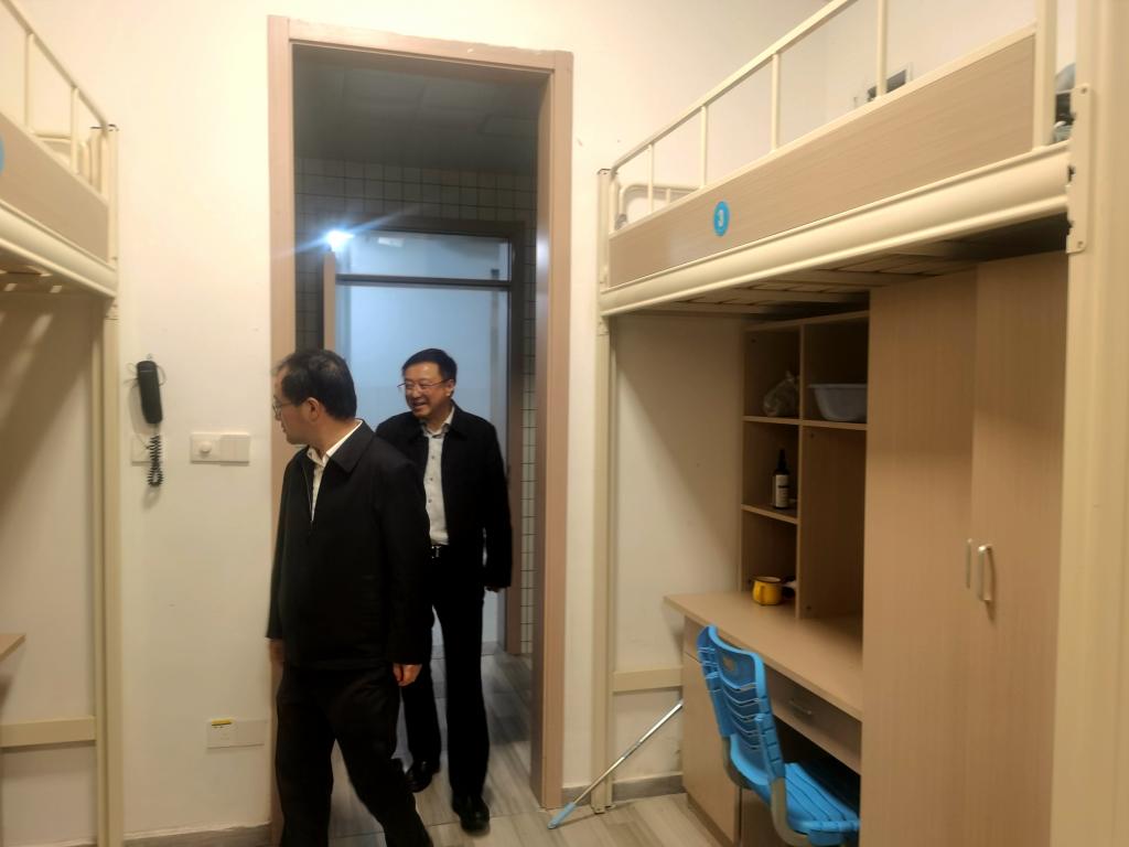 在校园值班校领导、校纪委书记高峻陪同下,宋局长走进教室、宿舍、学生成长与发展中心,了解了住宿生晚自修及学生宿舍改造情况,与备赛无锡市职业学校创新创业大赛选手及晚自修学生亲切交流。
