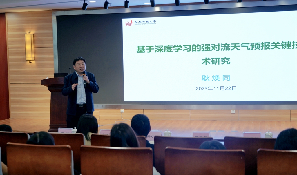 江苏开放大学党委常委、副校长耿焕同和与会师生共同分享了《基于深度学习的强对流天气预报关键技术研究》学术讲座。耿校长站在科研的前沿,高瞻远瞩,从讲座的标题引言,不仅科普了许多科学论点,介绍了切身探索成果的历程,更传递了先进的科研理念。耿校长还就我们的教育教学应对人工智能时代的发展、开放大学的青年教师如何做好教科研工作进行了互动和建议。