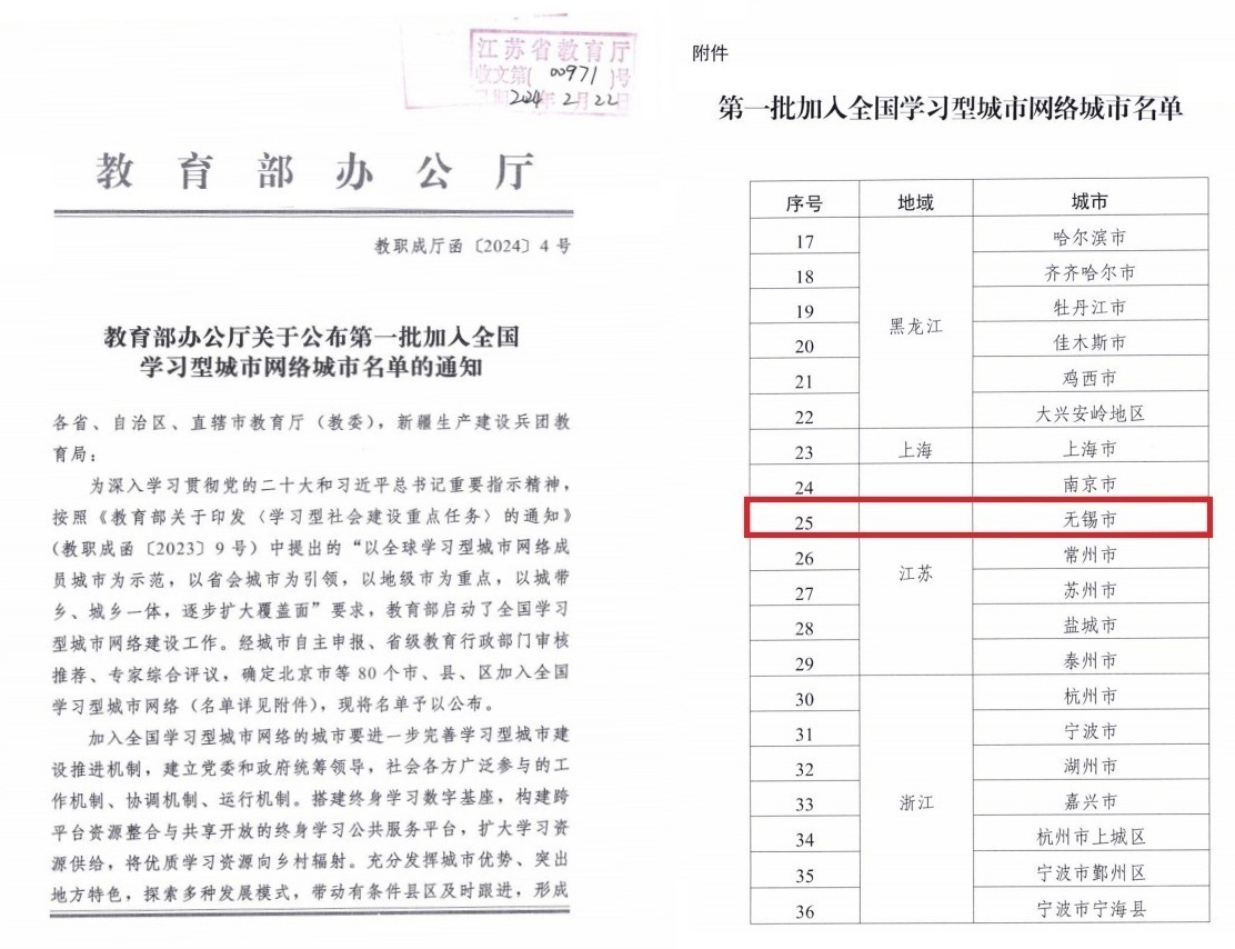 近日,教育部公布第一批加入全国学习型城市网络城市名单,我市榜上有名。全国学习型城市网络建设工作是以全球学习型城市网络成员城市为示范,以省会城市为引领,以地级市为重点,以城带乡、城乡一体,逐步扩大覆盖面,以建设全民学习、终身学习的学习型社会为目的的一项战略性工作。一直以来,无锡市高度重视终身教育体系构建和学习型城市建设,着力打造全纳型、普惠型、融合型终身教育学习体系。2023年9月,学校在市教育局的领导和指导下,细致认真开展具体申报工作。无锡开放大学作为服务全民终身学习的新型高校,积极发挥办学功能,致力于打造“锡心勤学、锡新助学、锡欣向学”的无锡终身教育名片,服务学习型城市建设。