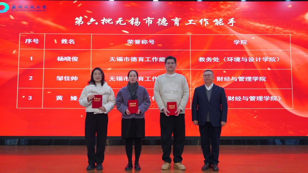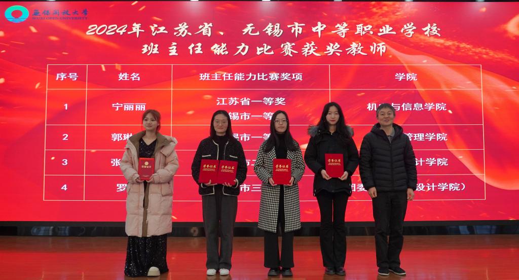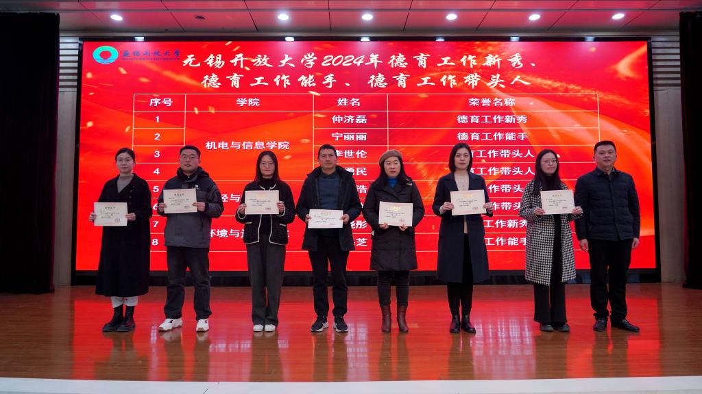 2025年1月15日上午,“润心共奋进,同心向未来”无锡开放大学2024年德育工作颁奖仪式暨“三业三型”班主任工作论坛在学校艺术楼报告厅成功举办。校党委书记贾厚林,校长、党委副书记田建军,党委副书记高峻,副校长杨磊云、丁晓华、宋祖楼出席颁奖仪式,各学院、行政部门负责人,“青蓝工程”结对师徒,班主任,获奖师生代表共同参加本次活动。