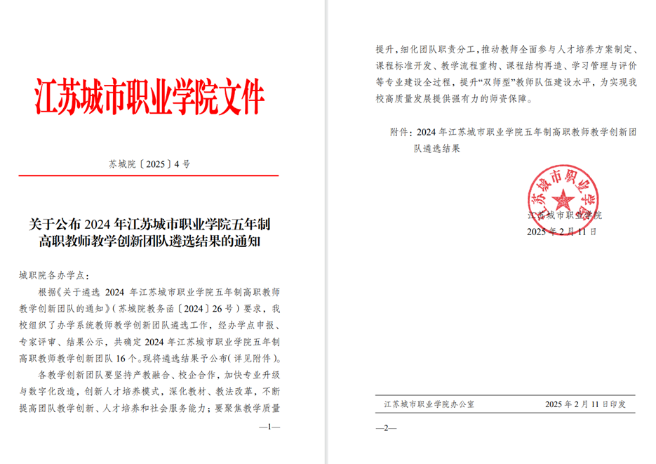 在江苏城市职业学院组织开展的五年制高职教师教学创新团队评选活动中,经过学校推荐、专家评审、结果公示等环节,我校两个团队成功入选江苏城市职业学院五年制高职教师教学创新团队。