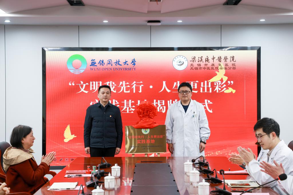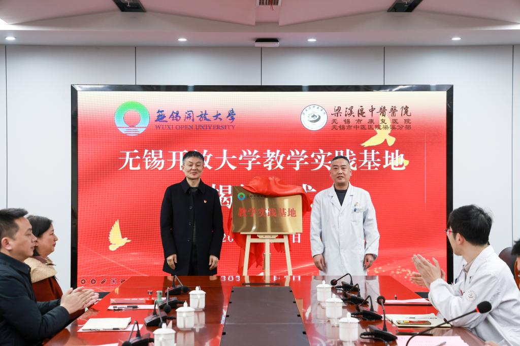 贾书记和顾书记共同为无锡开放大学教学实践基地揭牌。该基地的成立将为我校康养学院在专业建设、师资力量、实践教学、科研合作等多个方面提供指导与帮助。