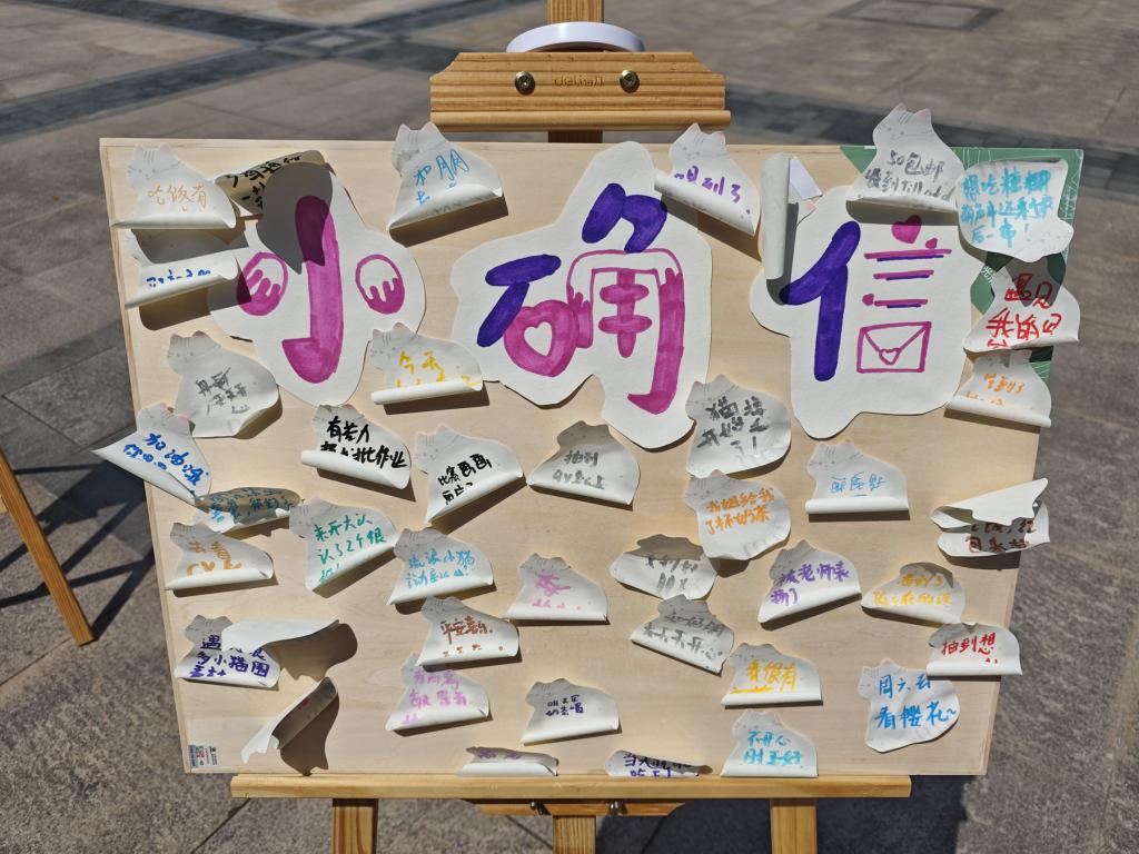 现场设置了“小确信”“小烦恼”和“时光邮局”三个互动区。同学们需要在便签上分别写下生活中的温暖瞬间、最近遇到的烦恼与困惑以及对未来的美好期待并投入对应的信箱,即可带走一只“快乐小狗”。活动吸引了近百名学生参与,大家敞开心扉,将积压的心理压力尽情释放,也向他人分享了自己的喜悦,在字字句句中找回了面对未来的勇气和信心。