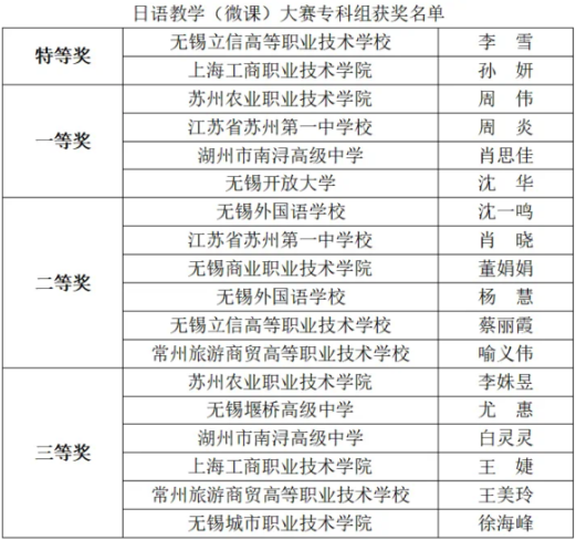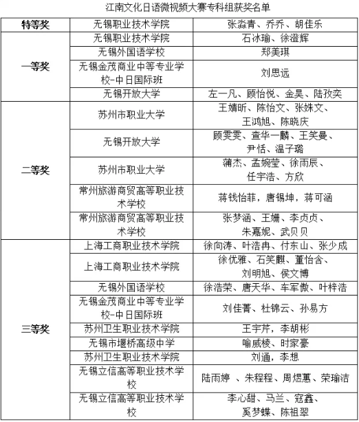 来自江苏省内各大专院校的选手参加了各项比赛,经过激烈的角逐,我校商务日语专业师生再创佳绩。22商日班周芸等十二位同学的话剧表演获才艺表演奖团体一等奖; 21商日左一凡团队、顾雯雯团队分别荣获江南文化日语微视频的一等奖和二等奖;武严,周以德,孙晓红老师荣获“优秀指导教师”称号;21商日班顾怡悦、袁娜同学双双获得日语演讲比赛专科组二等奖;沈华老师荣获“优秀指导教师”称号;沈华老师的微课获得日语教学(微课)大赛一等奖。我校被评为优秀组织单位。