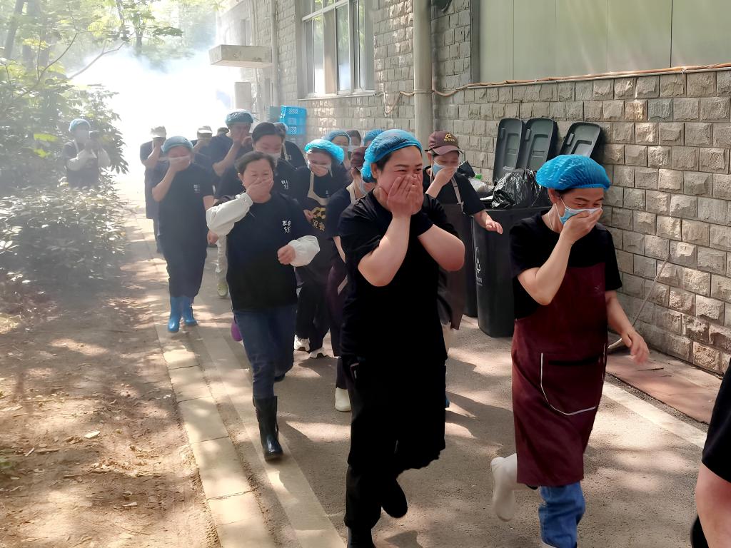 随后,食堂全体工作人员参加了厨房突发燃气泄漏处置和突发火灾处置演练。随着烟雾扩散,指挥组果断下令全员撤离。疏散人员按照预定路线,用湿毛巾捂住口鼻,弯腰沿墙通过安全通道快速撤离,安全撤离至集合点。