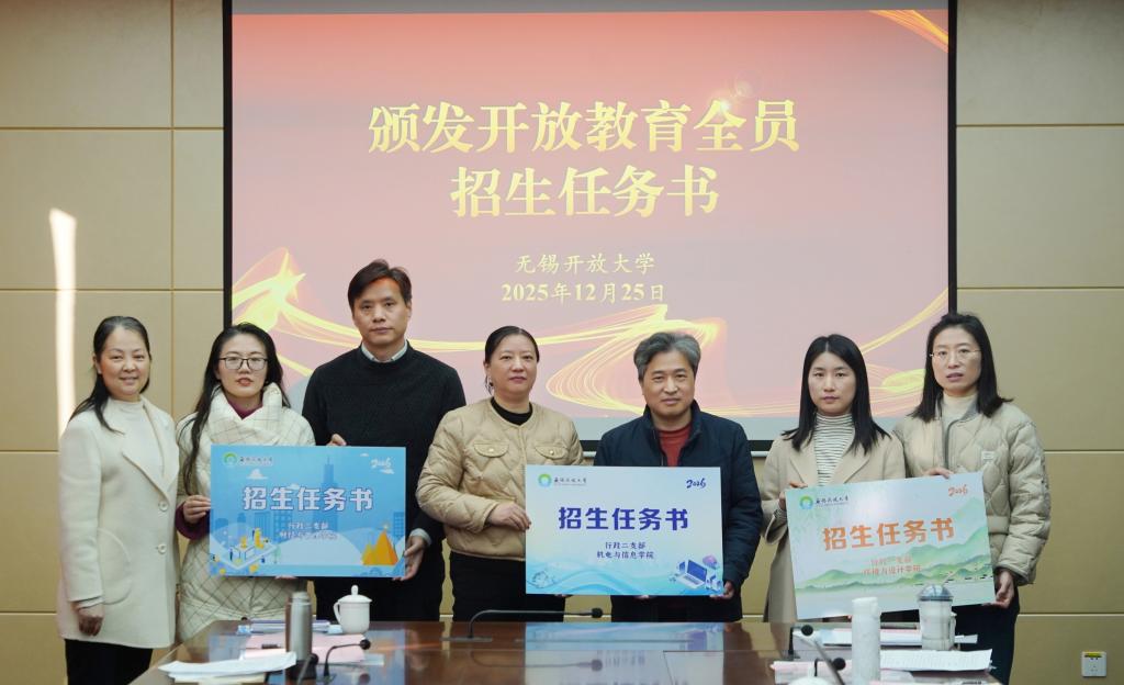 随后,招生工作处副处长许玥菲对《无锡开放大学开放教育全员招生工作方案》进行了详细解读。根据此方案,副校长杨磊云给学校三个招生工作组,即环境与设计学院和行政一支部工作组、机电与信息学院和行政二支部工作组、财经与管理学院和行政三支部工作组下达了2026年开放教育全员招生任务书。