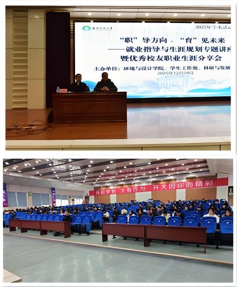 12月24日下午,我校2025年学术活动月系列活动——环境与设计学院“‘职’导方向·‘育’见未来”就业指导与生涯规划专题讲座暨优秀校友分享会成功举办。活动在艺术楼报告厅与3号楼二楼阶梯教室同步开展,覆盖21级全体毕业班及22级部分学生。本次活动形式多样、内容丰富,以专题讲座、校友分享、互动交流等形式,为学生廓清迷雾,明晰职业方向、增强发展信心。活动由学院武靖副院长主持。