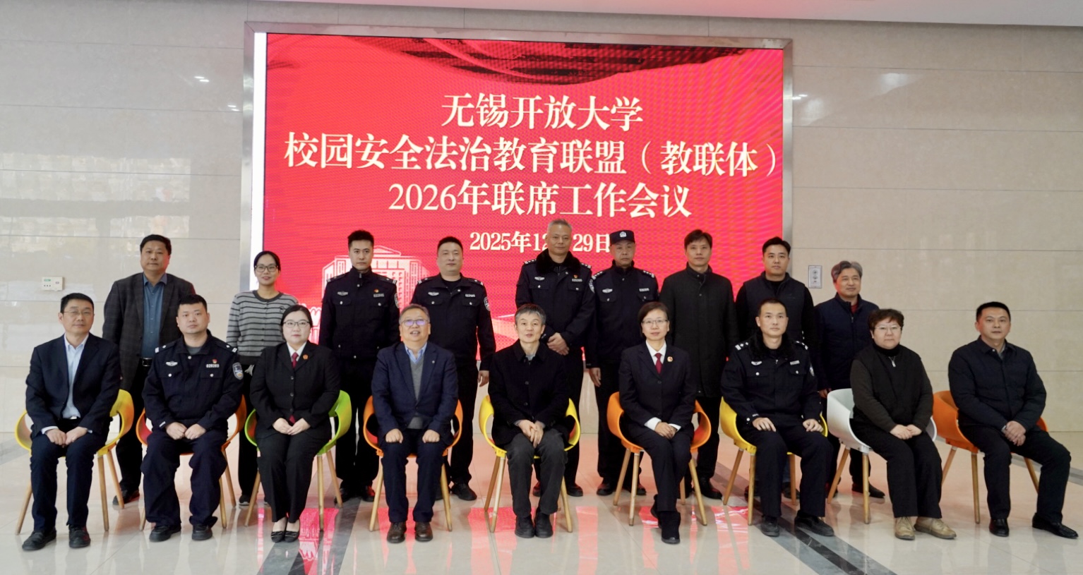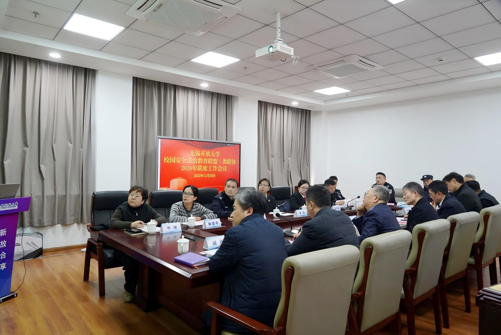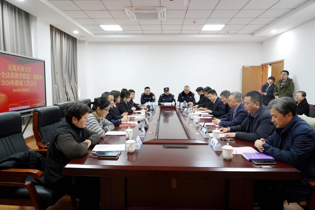 岁末冬深,暖意正浓,校地协同,再谱新篇。12月29日下午,无锡开放大学校园安全法治教育联盟(教联体)2026年联席工作会议在远教大楼201会议室召开。校党委书记贾厚林,校长、党委副书记田建军,原党委书记、校关工委副主任奚小网,联盟成员单位无锡市人民检察院三级高级检察官陈炜,无锡市中级人民法院行政庭副庭长崔晓萌,梁溪公安分局内保大队副大队长唐震、警官钱洪,梁溪人民检察院未成年人检察部主任朱亚平,上马墩派出所教导员杨朝元、“小蔡警官工作室”负责人蔡源,梁溪交警大队五中队中队长李博,梁溪公安分局禁毒大队警官范海,广益街道塔影苑社区党总支书记、居委会主任蔡珺以及学校各学院、相关部门负责人齐聚一堂,共同商议校园安全法治教育大计,携手筑牢校地协同育人防线。会议由副校长宋祖楼主持。