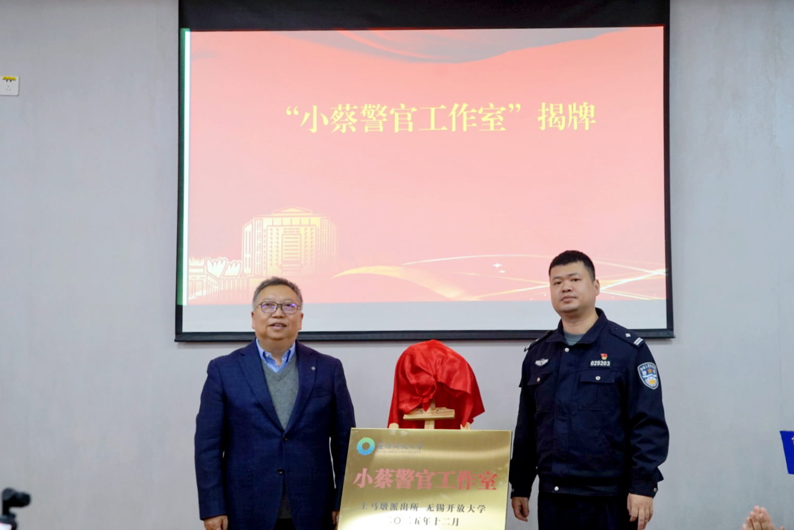 校长田建军和杨朝元教导员共同为“小蔡警官工作室”揭牌