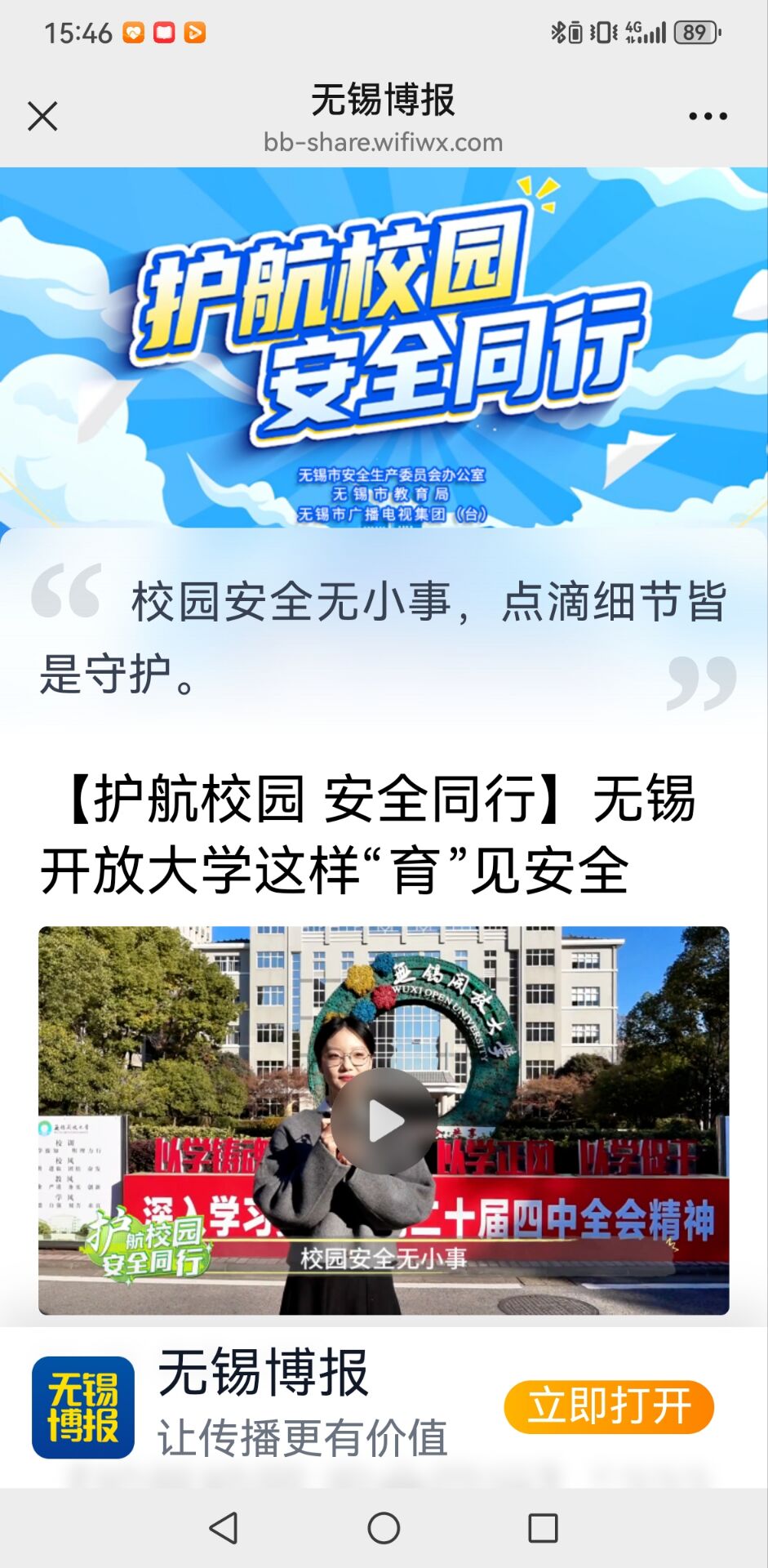 近日,在无锡市安全工作委员会办公室、无锡市教育局的遴选与统筹指导下,由学校安全保卫处牵头撰写脚本、无锡广通传媒股份有限公司摄制的《护航校园,安全同行——走进无锡开放大学》安全主题宣传视频正式上线。1月5日,宣传内容同步登陆锡城公交、地铁移动电视及无锡博报App,以万屏联动的传播态势,将无锡开放大学的校园安全理念精准传递至千家万户。