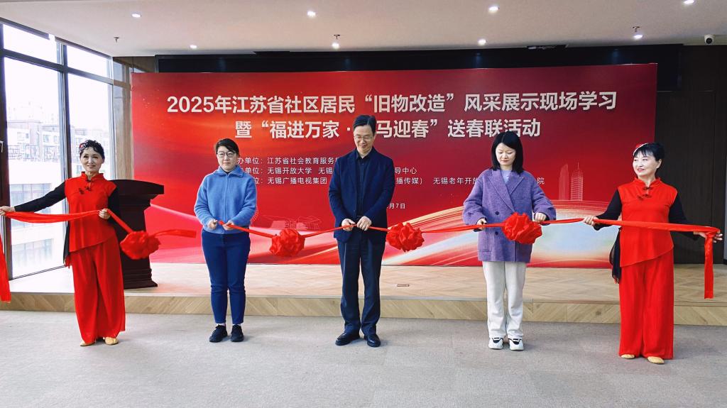 为深入推动社区教育高质量发展,倡导绿色低碳生活理念,展示社区居民的巧手匠心与环保智慧,2月7日上午,由江苏省社会教育服务指导中心主办,无锡开放大学、无锡市社会教育服务指导中心承办的2025年江苏省社区居民“旧物改造”风采展示现场学习暨“福进万家·骏马迎春”送春联活动在无锡老年开放大学(太湖)分院成功举行。活动吸引了来自无锡老年开放大学师生、街道社区代表、文艺骨干及周边居民等百余人齐聚一堂,共迎新春,共话环保。