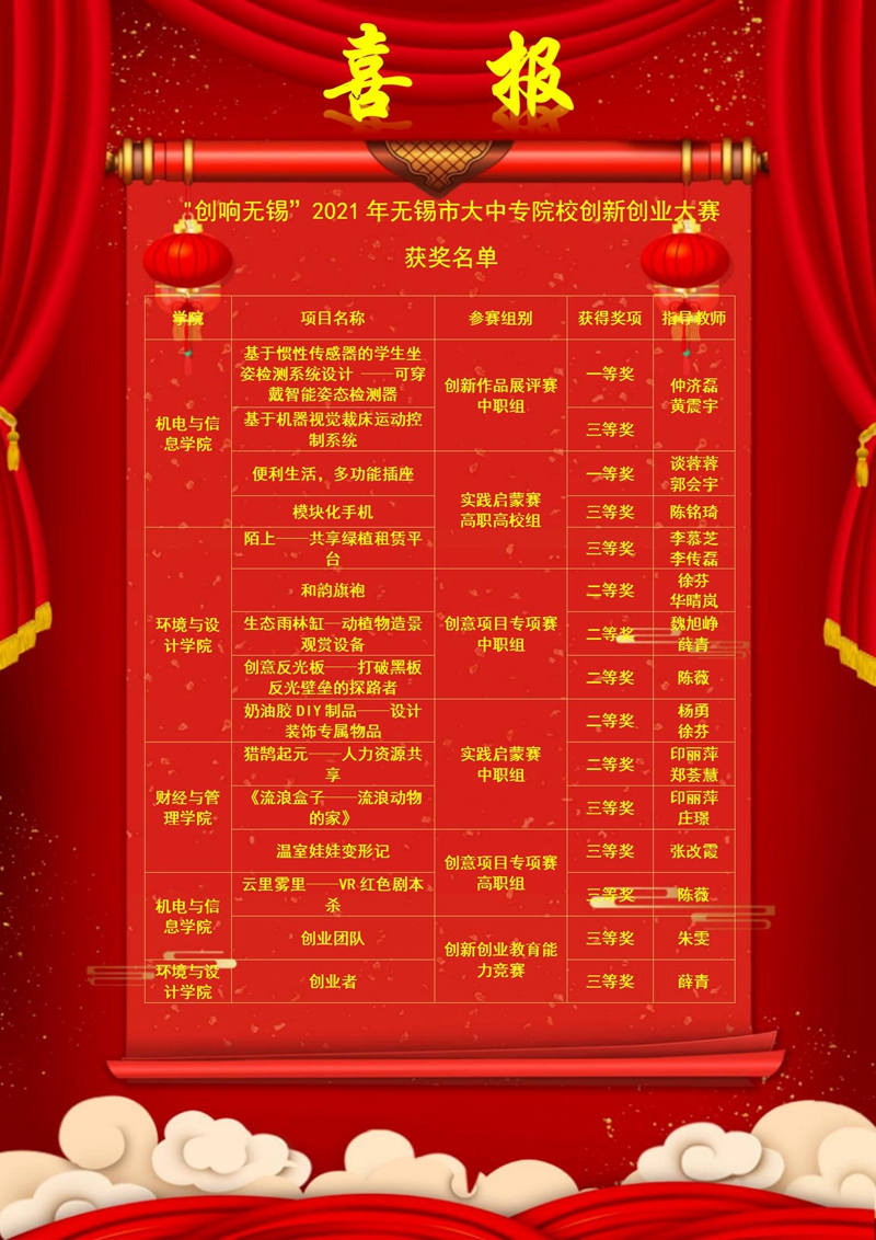 4月18日-22日,2021年“创响无锡”全市大中专院校创新创业大赛总决赛通过“云上赛”形式举办。工作室团队成员积极响应学校号召主动参与,参加了实践启蒙赛、创新作品展评赛等多个赛项的比赛。受新冠疫情冲击,大赛总决赛改用“云上赛”方式进行,比赛形式变化大、备赛任务重。工作室成员谈蓉蓉,仲济磊,黄震宇,杨勇,陈铭琦,朱雯在学校多部门的支持下,克服困难指导学生奋力拼搏取得了较好成绩,在此次比赛获一等奖两项,二等奖一项三等奖两项,教师获得三等奖一项。