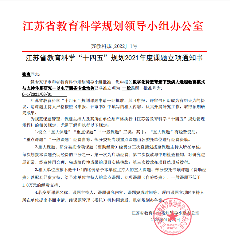 张惠老师江苏省教育科学“十四五”规划2021年度课题(江苏省教育科学规划领导小组办公室)获得立项
