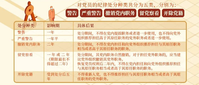 《中国共产党纪律处分条例》规定,对党员的纪律处分种类共分为五类,分别为警告、严重警告、撤销党内职务、留党察看和开除党籍。